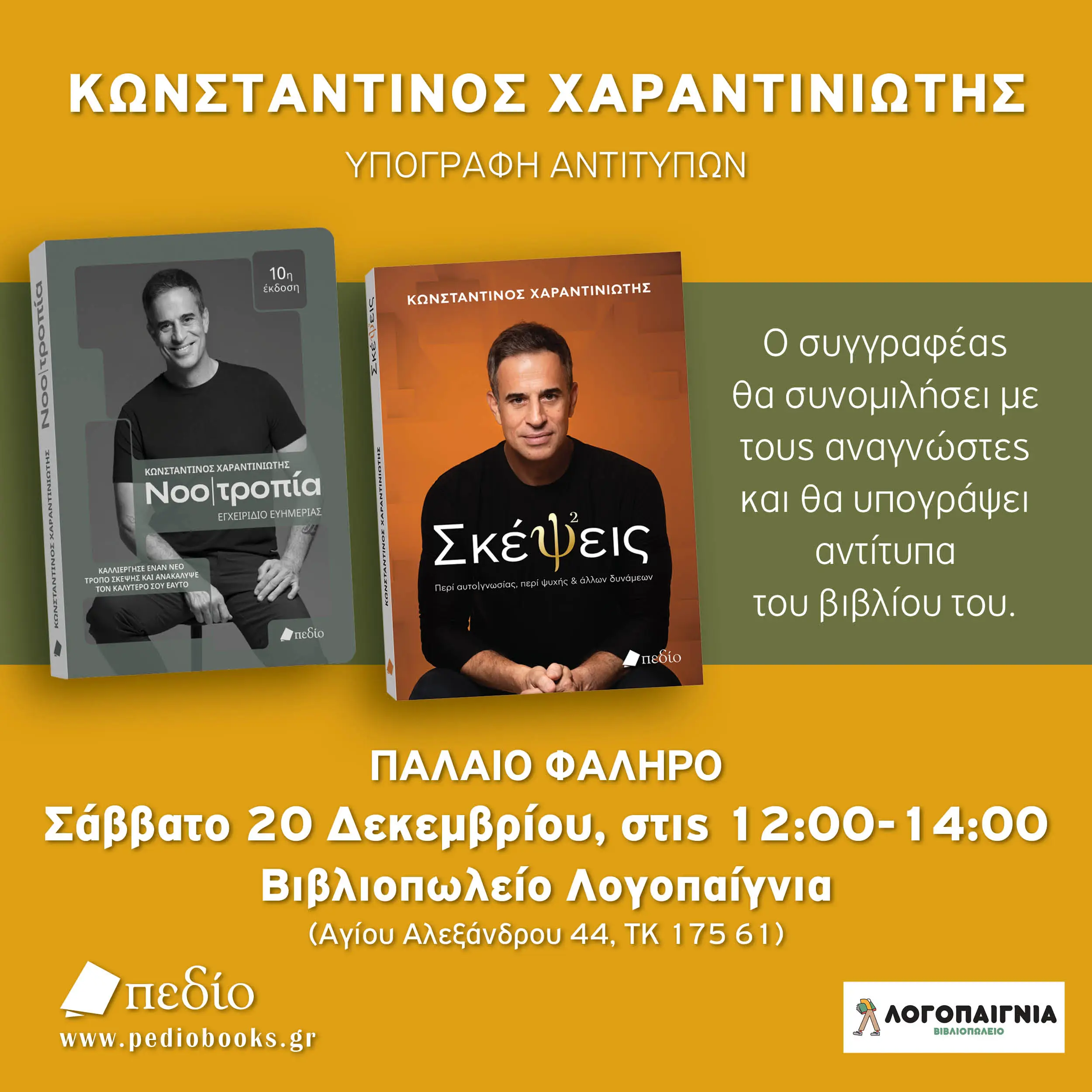Το βιβλιοπωλείο ΛΟΓΟΠΑΙΓΝΙΑ με μεγάλη χαρά φιλοξενεί τον Κωσταντίνο Χαραντινιώτη. Ο συγγραφέας θα συνομιλήσει με τους αναγνώστες και θα υπογράψει αντίτυπα του βιβλίου του, το Σάββατο 20 Δεκεμβρίου, στις 12:00 – 14:00.